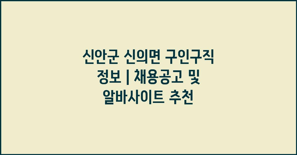 A1: 신안군 신의면 구인구직 정보 | 채용공고 및 구직사이트 추천으로 '잡코리아'와 '사람인'을 추천드립니다. 이 외에도 지역 커뮤니티와 알바 전문 사이트를 활용하세요!