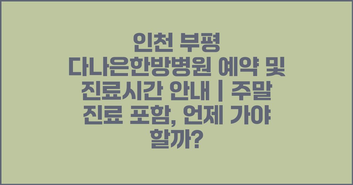 병원에서도 환자의 편의를 고려하여 주말 진료를 제공하고 있습니다. 그러므로 예약 시기가 주말로 나오면 가능한 빨리 확보하는 것이 좋습니다. 이렇게 하면 평일의 바쁜 일정 속에서도 한방 치료를 통해 마음의 평화를 찾을 수 있겠죠. 인천 부평 다나은한방병원 예약 및 진료시간 안내 | 주말 진료 포함과 같은 정보를 잘 확인하여 놓치지 마세요.